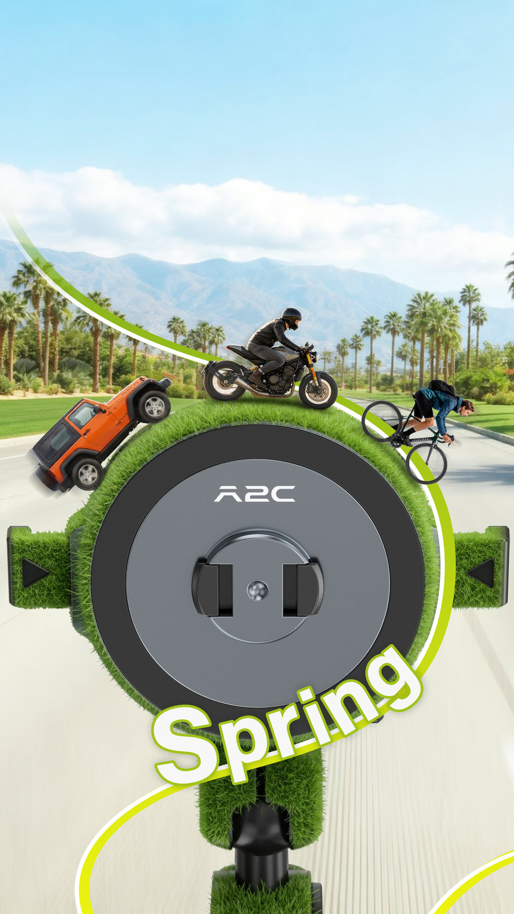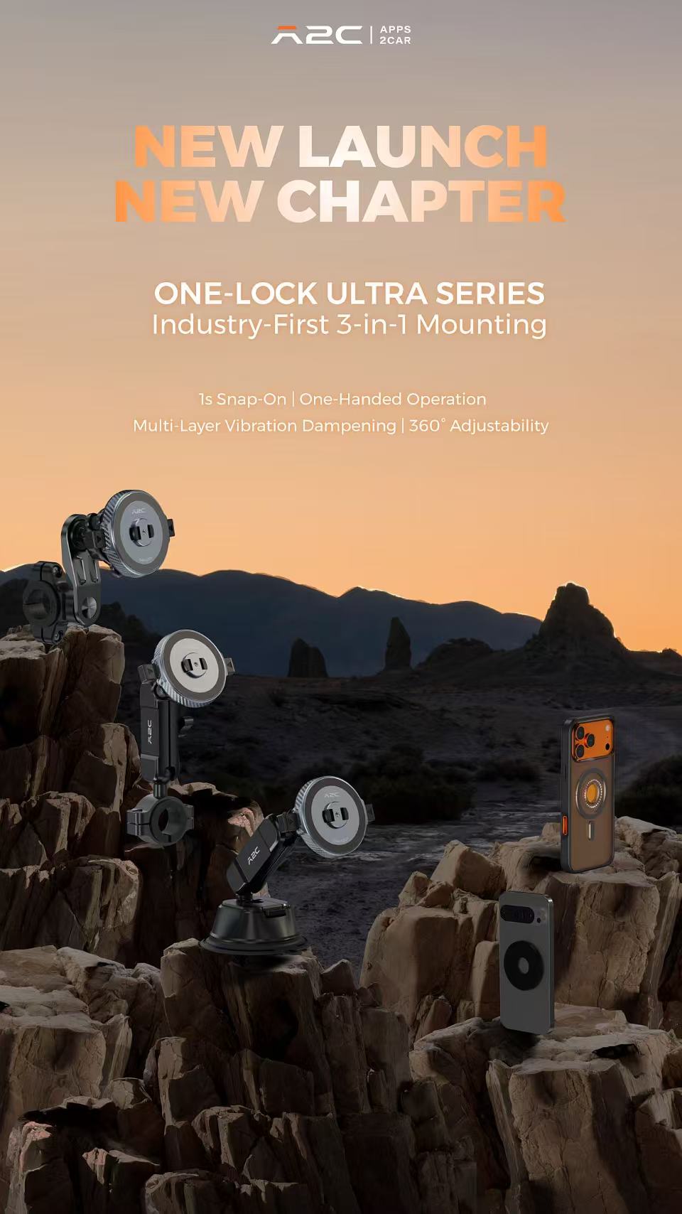 The A2C One-Lock Series is designed for every ride—car, motorcycle, or bike.Featuring one-click locking, full 360° phone rotation, and built-in vibration damping, it delivers rock-solid stability,so you can ride with confidence.